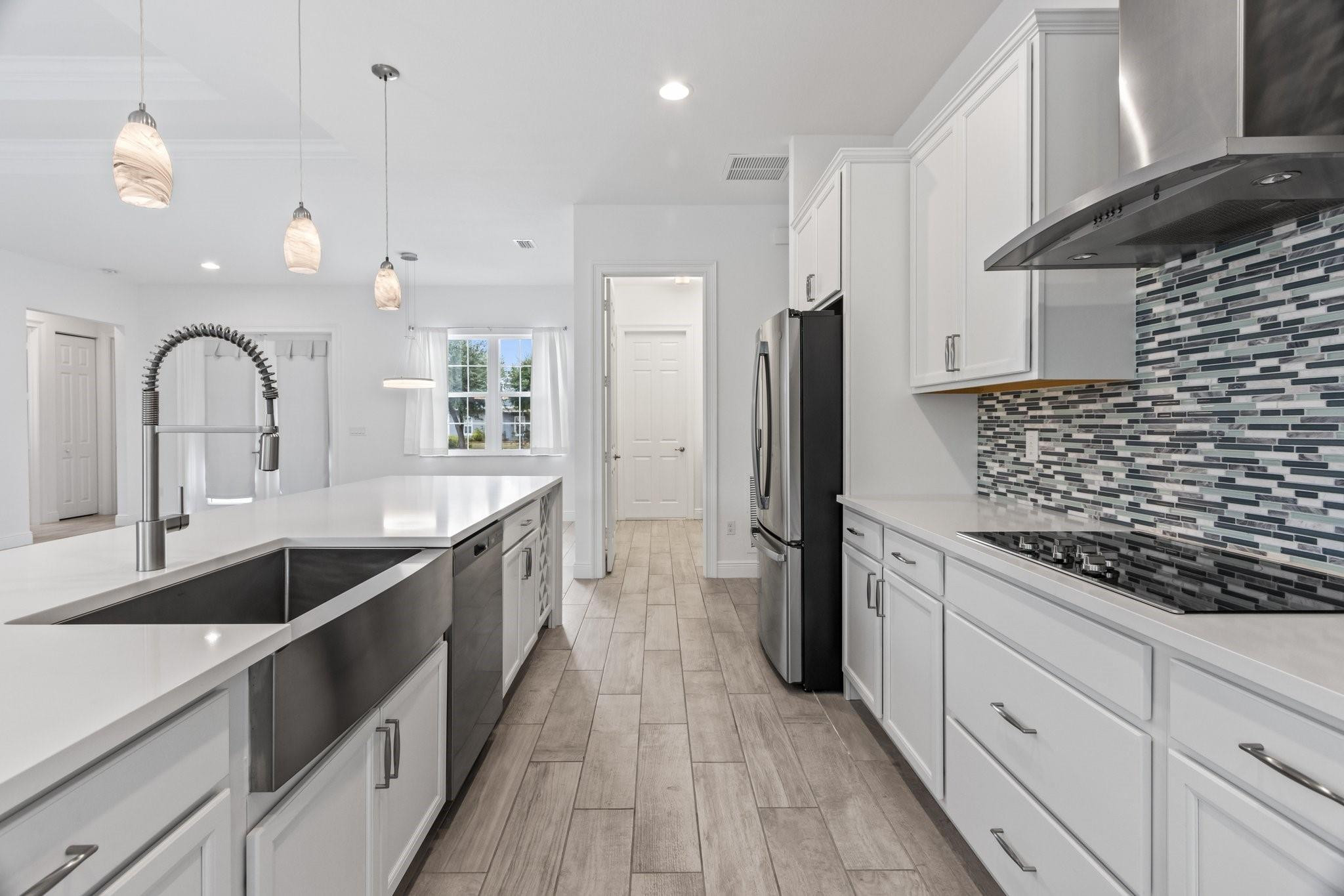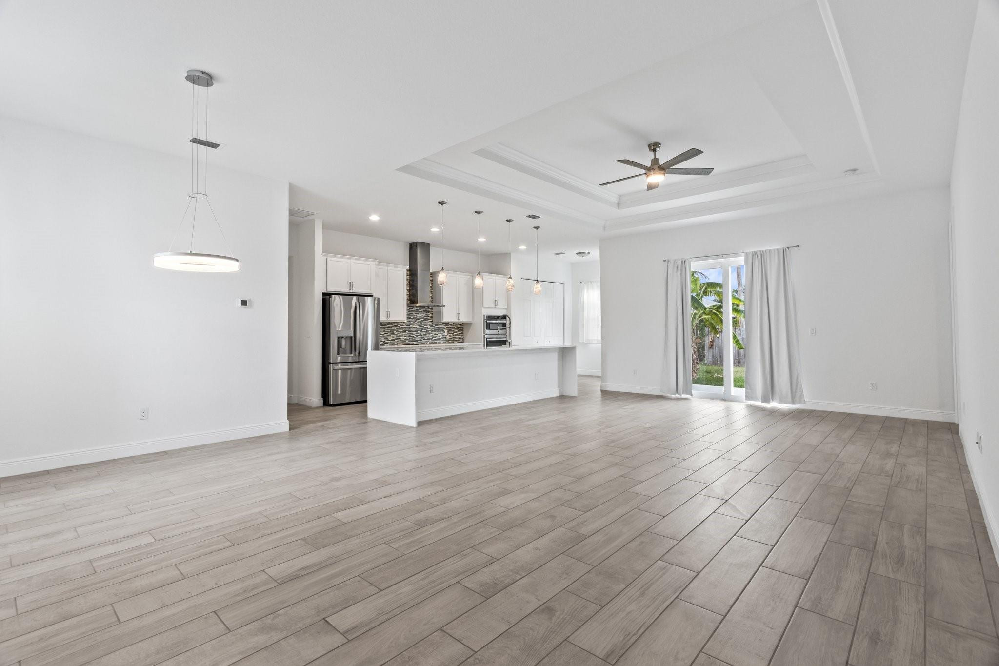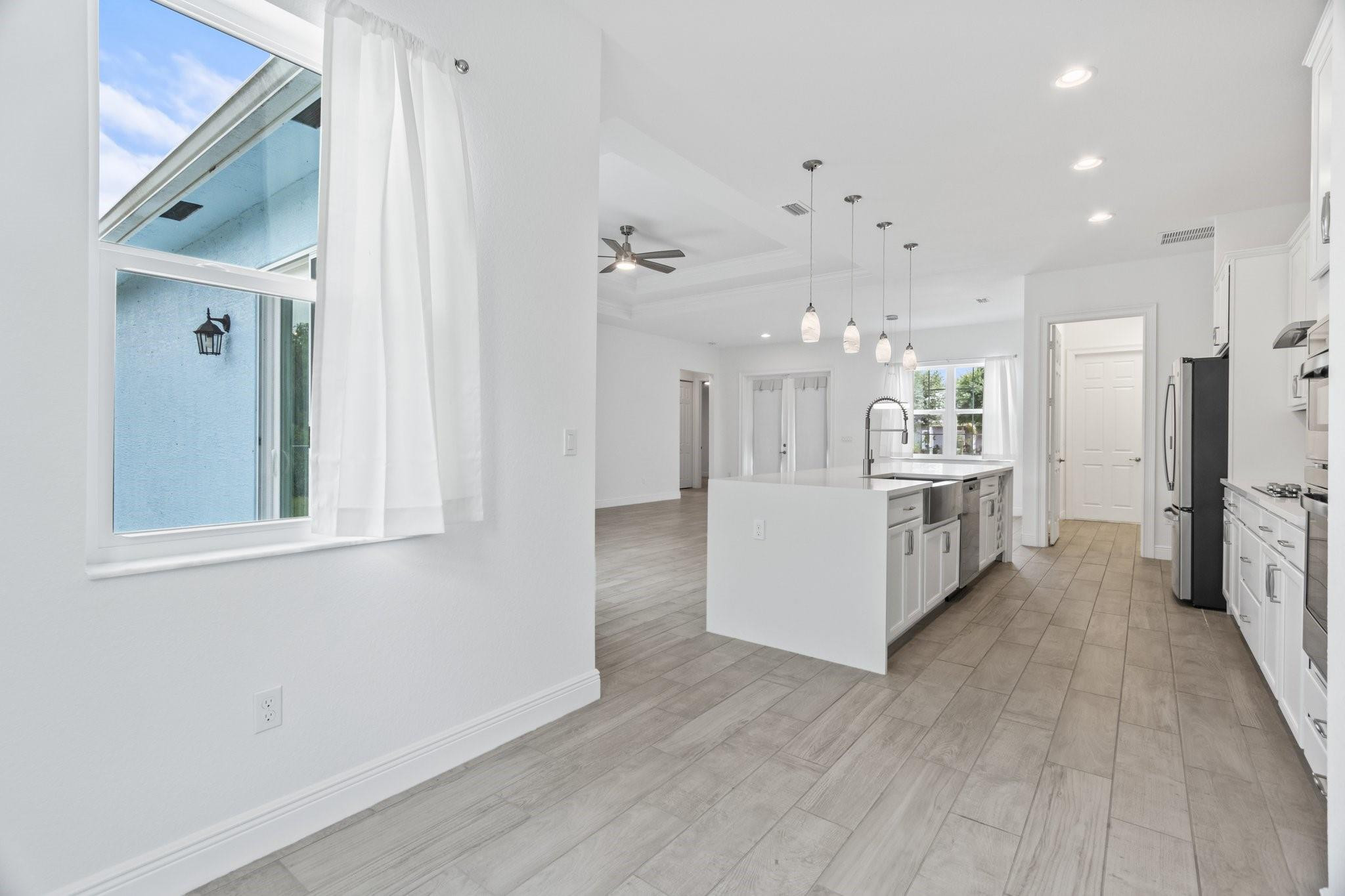 Newer single story home. Tile plank flooring throughout, modern gourmet kitchen with pendant lighting and a oversized long island with plenty of room for extra barstool seating. This home features a split bedroom floor plan, open living spaces, breakfast eating area, tray ceilings, spacious laundry room with a washer and dryer, walk in closets, spacious garage, back yard, and circular driveway with lots of room for parking. Close to shopping, dining, and easy access to major highways.